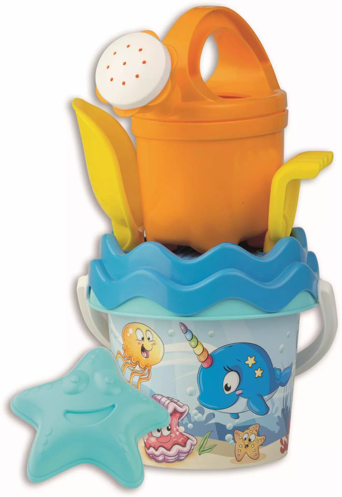6dílná sada na písekTato sada na písek je vyrobena z kvalitních plastů v Itálii a obsahuje následující prvky: Kyblík: Průměr: 13 cm, Výška: 11 cm Konvička 0,5 l Sítko Lopatka Hrabičky Tvořítko ve tvaru mořské hvězdiceRozměry sady: Výška: 29 cm, Váha: 0,35 kg