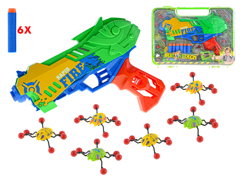 S touto skvělou pistolí v kufříku si užijete spoustu zábavy. Pistole má velikost 24 cm a je na natažení. Součástí balení je 6ks pěnových nábojů a hmyz jako terč. Podstatou hry je sestřelit, co nejrychleji všechny brouky . Dokážeš je sestřelit dřív než tvůj soupeř?