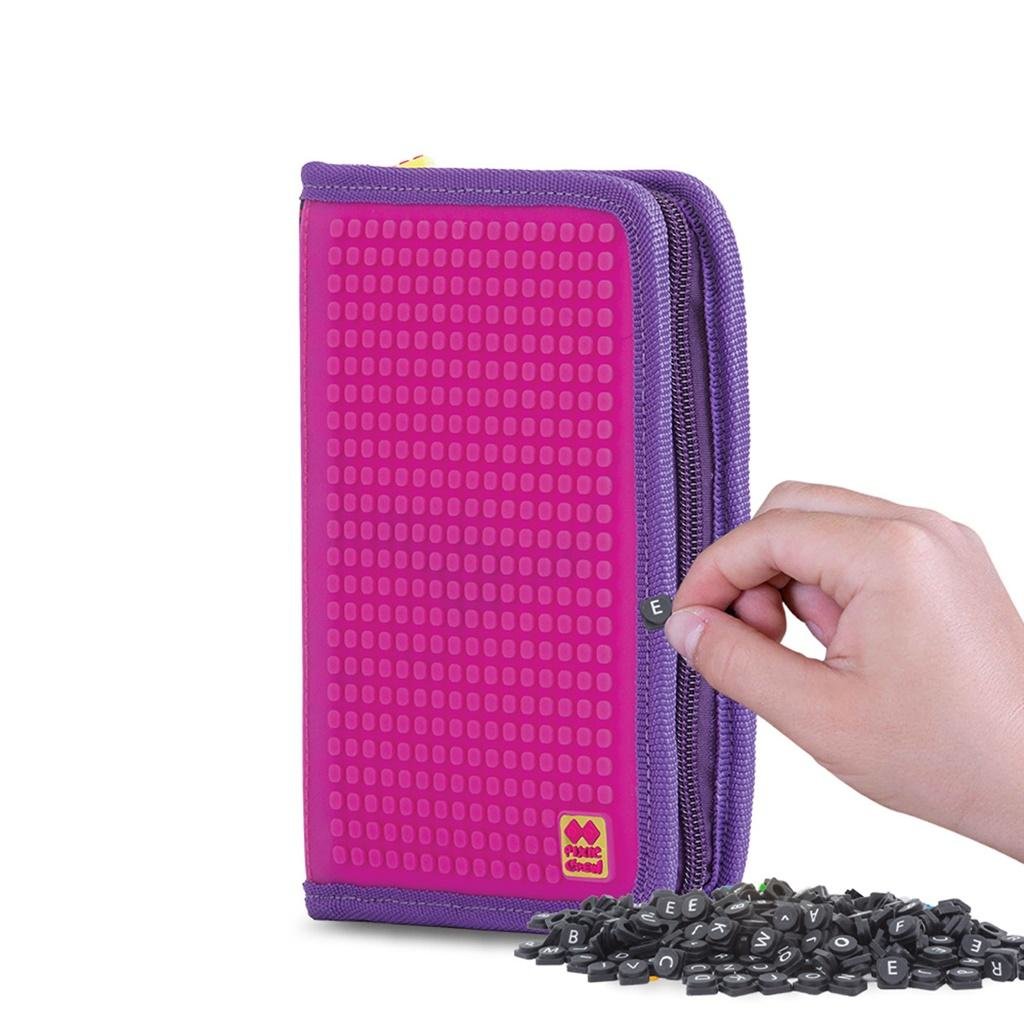 Szkolny piórnik na suwak PIXIE CREW z motywem liter alfabetu, posiada kreatywny purpurowy panel, na którym można tworzyć oryginalne i spersonalizowane grafiki, za pomocą małych silikonowych pikseli. Piórnik wykonany został z poliestru. Wewnątrz znajduje się wystarczająco dużo miejsca na przybory szkolne. Jest 16 klasycznych gumek, do których można wsunąć ołówki, czy długopisy oraz 4 szersze na linijkę, gumkę, czy nożyczki. Wnętrze zawiera także transparentną kieszonkę. Piórnik jest sprzedawany z dodatkowym darmowym zestawem około 100 pikseli.