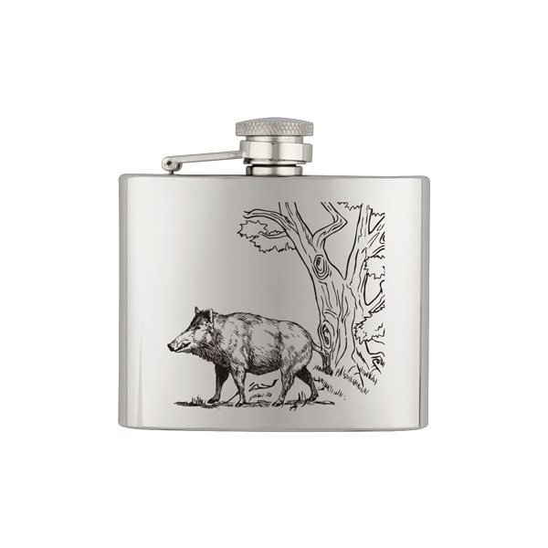 Placatice na nápoje, na jejíž přední části je obrázek divokého prasete v přírodě. Šroubovací víčko zajištěné k tělu placatky, abyste ho po odšroubování neztratili. Objem - 120 ml, materiál - nerezová ocel.