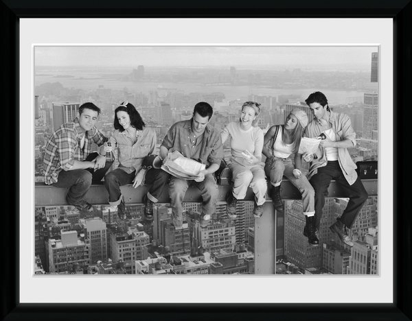 Zarámovaný obraz se seriálovými přáteli sedícími na traverze nad New Yorkem. Stylový doplněk do bytu, kanceláře nebo herny pro fanoušky seriálu Friends. číst celé