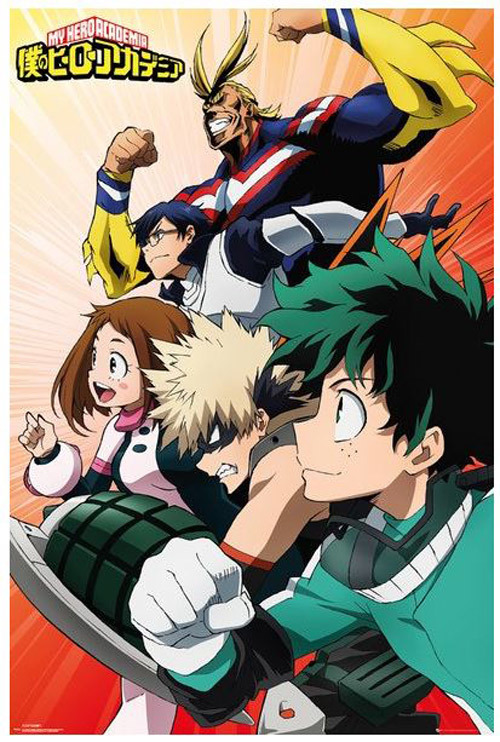 Oficiální plakát z katalogu produktů s logem, fotografiemi a grafikou japonského animovaného seriálu My Hero Academia.