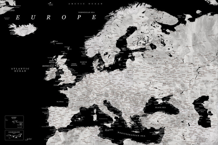 Plakát, Obraz - Blursbyai - Black and grey detailed map of Europe, 120 × 80 cm