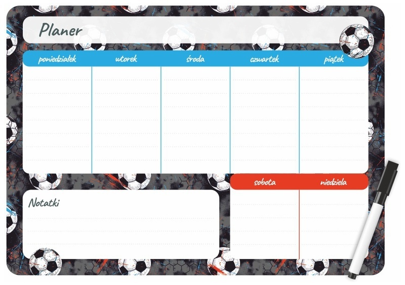 Planer magnetyczny 35x25 tygodniowy piłki + marker kod: PM-02-02 - planer na lodówkę z motywem z Kolekcji nadruków - wyposażony w magnetyczny podkład, dzięki któremu można umieścić go na lodówce, jak i każdej innej powierzchni metalowej - układ tygodniowy znacznie ułatwi zaplanowanie najważniejszych wydarzeń tygodnia czy też zanotowanie planu lekcji dziecka - powierzchnia suchościeralna pozwala na wieloktrotne użycie planera (zalecamy stosowanie akcesoriów do tablic suchościeralnych) - nadaje się zarówno do domu, szkoły czy biura - GRATIS dedykowany, czarny marker z magnesem i gąbką - wymiary: 25x35 cm