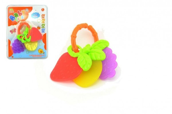 * chrastítko a kousátko ve výrazných barvách (žlutá, fialová, červená) s motivy ovoce (citronek, jahůdka, hrozny vína) podněcují rozvoj sluchu, zraku a hmatu dítěte.