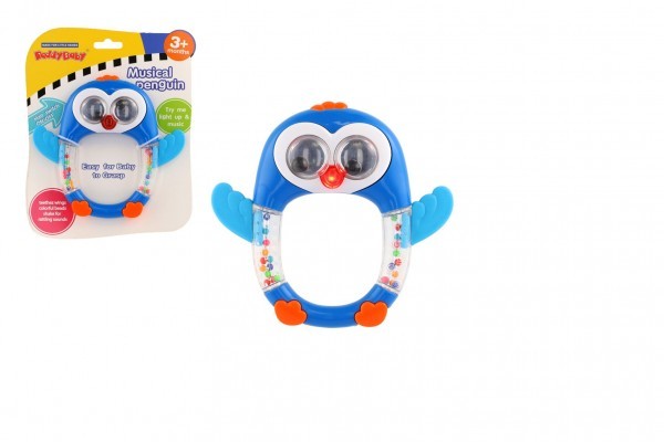 Chrastítko/Kousátko tučňák plast 15x14cm na baterie se zvukem, světlem na kartě 3m+