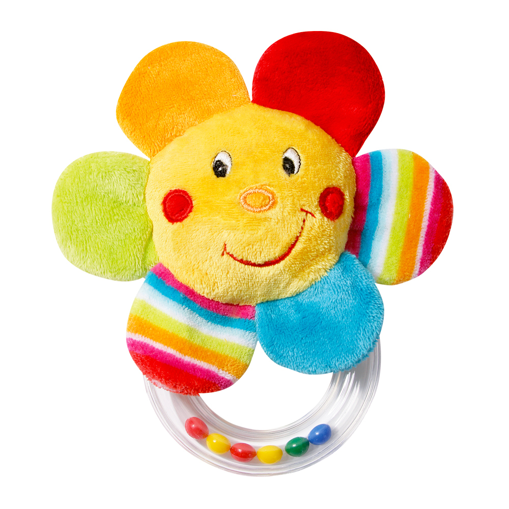 Hravé pestrobarevné chrastítko kytička s plastovým kroužkem naplněným mnohobarevnými kuličkami.