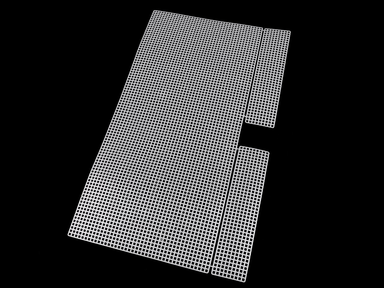 Tento polotovar má rozměry přibližně 25 x 24 x 5,5 cm a nabízí dostatek prostoru pro osobní úpravy. Díky pevné struktuře plastu je kanava ideální pro použití se silnější přízí, rypsovou stuhou nebo šňůrou, které snadno projdou čtverečky a zároveň dobře drží tvar kabelky. Po celý povrch kanavy jednoduše vyšijete nebo uháčkujete vzory a detaily, poté ji sešijete po stranách.