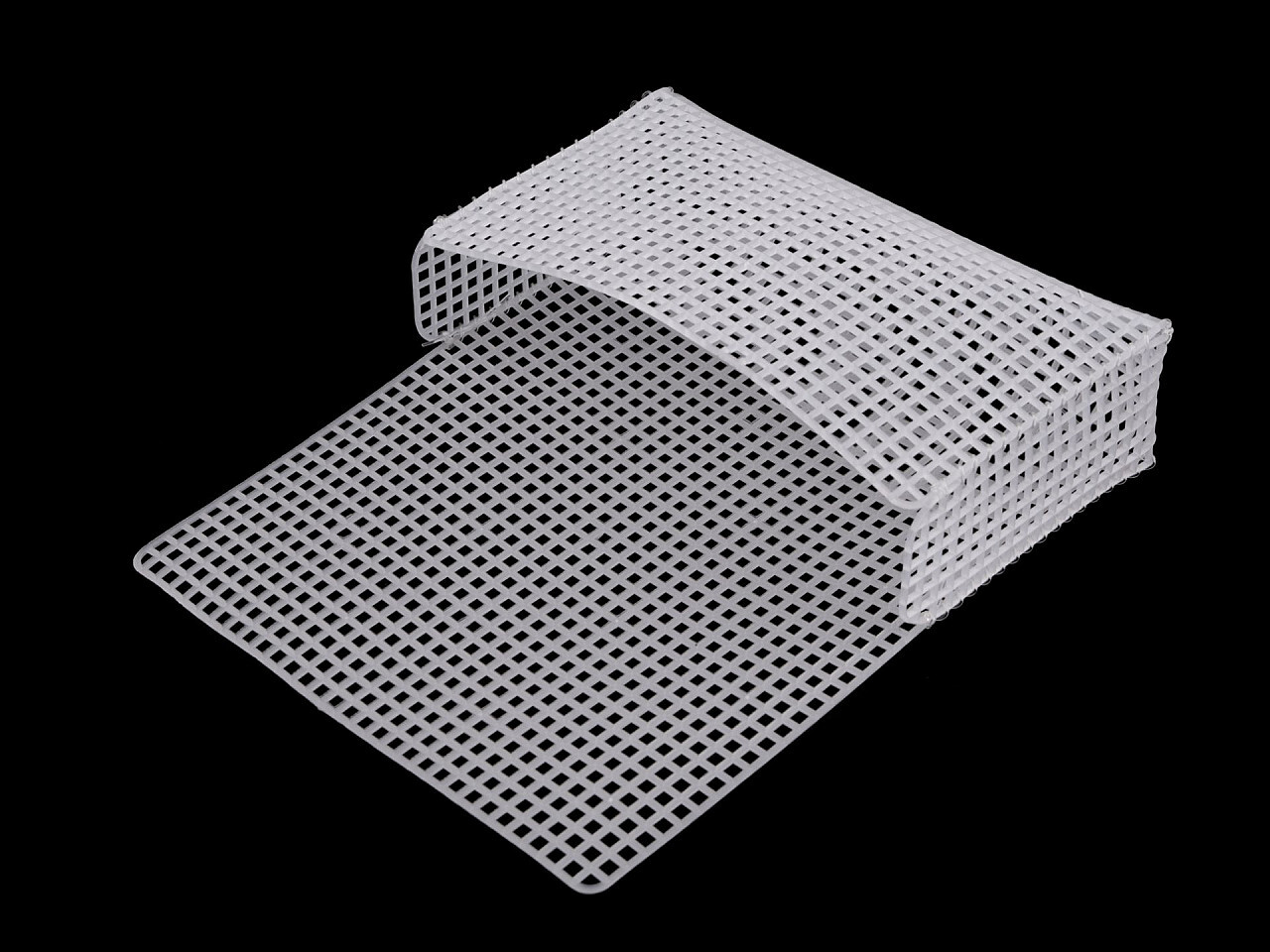 Tato kanava s rozměry přibližně 19 × 11 × 4 cm slouží jako pevný základ kabelky s klopou. Díky otvorům o velikosti 4 × 4 mm je vhodná na výšivku silnější přízí, šňůrou nebo odolnějšími stuhami, například rypsovou páskou. Po celém povrchu můžete kanavu ozdobit podle své fantazie a poté ji jednoduše sešít po stranách do finální podoby kabelky.