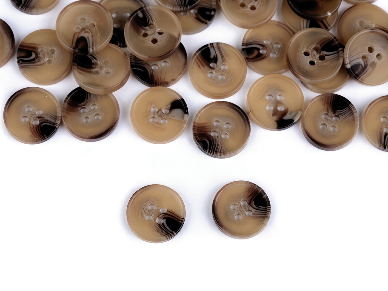 Čtyřdírkové designové knoflíky mají zesílený okraj. Vyniknou na kabátech, svetrech, vestách, sakách apod. Velikost knoflíků naleznete v této tabulce.