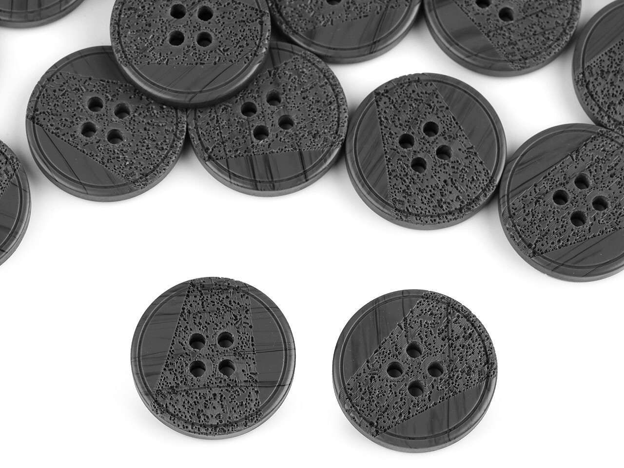 Čtyřdírkové knoflíky mají z části laserem vygravírovaný povrch. Vyniknou nejen na kabátech, ale i na svetrech, vestách apod. Velikost knoflíků naleznete v této tabulce.