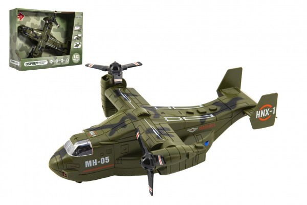 Letadlo vojenské plast 26cm na setrvačník na baterie se světlem se zvukem v krabici 31x24x11cm