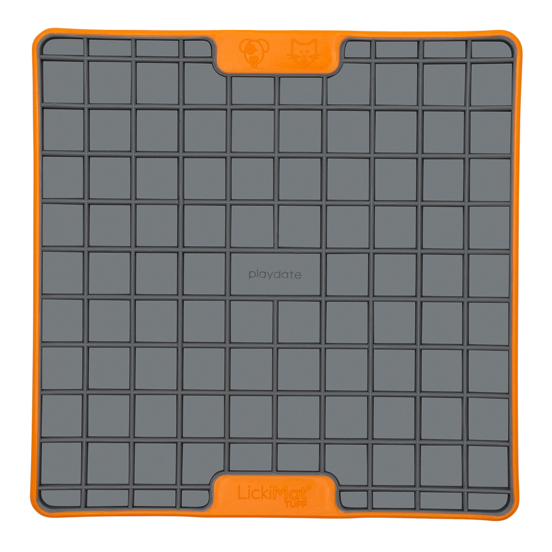 Podložka Playdate TUFF je z tvrzené přírodní gumy (kaučuku) zasazená v barevném plastovém rámečku s protiskluzovými body na spodní straně. Na rozdíl od měkkých podložek LickiMat Playdate je pevná, odolá i nějakému tomu kousanci a snese mytí v myčce. Je proto vhodná pro štěňata, která ráda všechno pokouší svými zuby a pro okusovače. Není určena na žvýkání, proto ji nedovolte pejskovi okusovat, ale když se to přihodí, hned si jí nezničí.