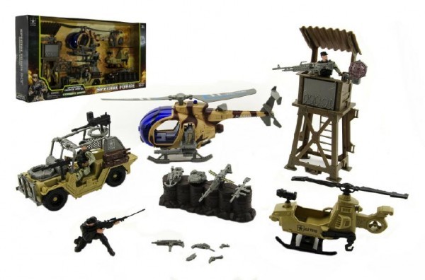 Vojenská základna s doplňky plast + vrtulník na baterie se světlem se zvukem v krabici 66x33x11cm