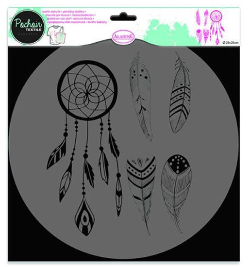 Plastová šablona, 28x28 cm. Nadčasové motivy, lapač snů a peříček zkombinujete do desítek textilních i dalších projektů.