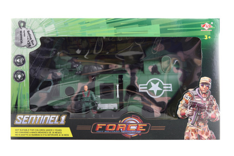 Plastová sada s velkým vojenským vrtulníkem a vojáčkem. Vrtulník svítí a vydává zvuky. Napájení na 2 AA baterie (nejsou součástí). Rozměry balení cca 55 x 32 x 20 cm. Věk 3+ číst celé