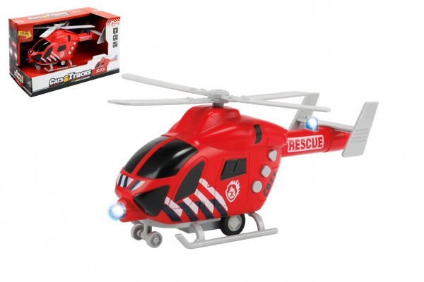 Vrtulník hasiči 20cm plast na setrvačník na baterie se světlem se zvukem v krabici 23x13x10cm