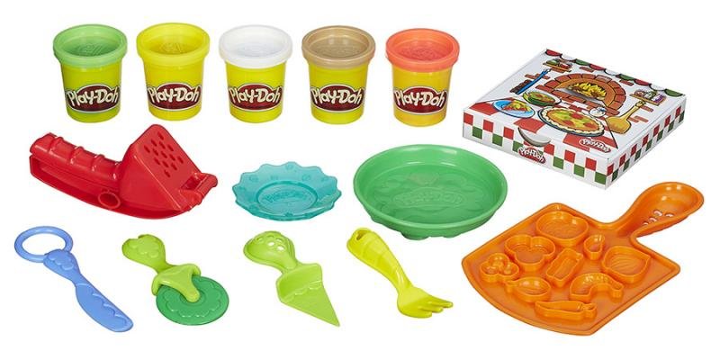 Pizza párty může začít v tvé vlastní Play-Doh pizzerii! Vyrobte ty nejbláznivější pizza koláče které si jen dokážete představit. Vyválejte těsto na pizzu v pánvi s válcem, nastrouhejte hromadu “sýra”, a pak přidejte své oblíbené ingredience. Můžete také struhadlo použít na vytlačení špaget. Sada obsahuje: Pizza pánev, „lopata“ na kousky pizzy, pizza krabice, kráječ na sýr, váleček, řezák, vidlička, nůž, talíř a pizza tvořítko & 5 standard kelímků modelíny Play-Doh.