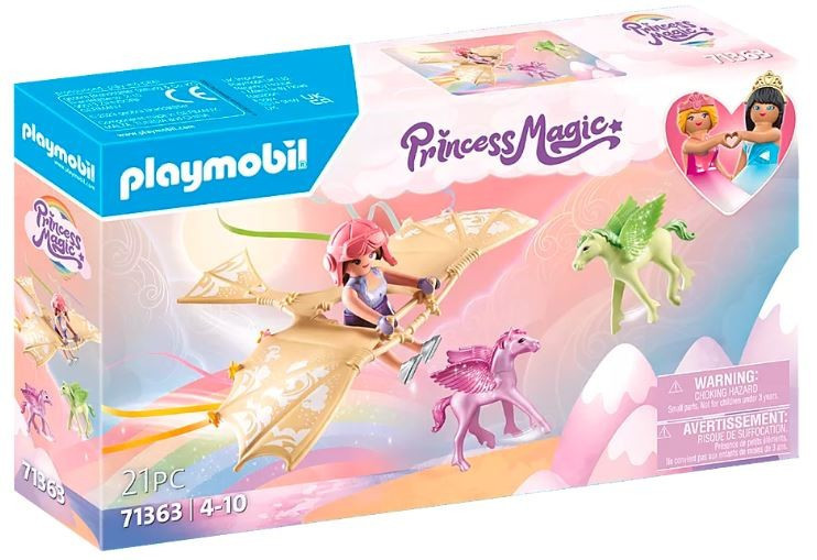 Wybierz się w niebiańskie podróże do tęczy z uroczymi pegazami PLAYMOBIL. Tęczowa księżniczka i jej mali towarzysze są nierozłączni i uwielbiają latać razem w chmurach. Dzięki zwinnemu szybowcowi księżniczka może towarzyszyć swoim ulubieńcom. Wspólnie trio wznosi się ponad chmury. Czarujące postacie, magiczne stworzenia i bajkowe budynki zabierają dzieci na wspaniałą przygodę.