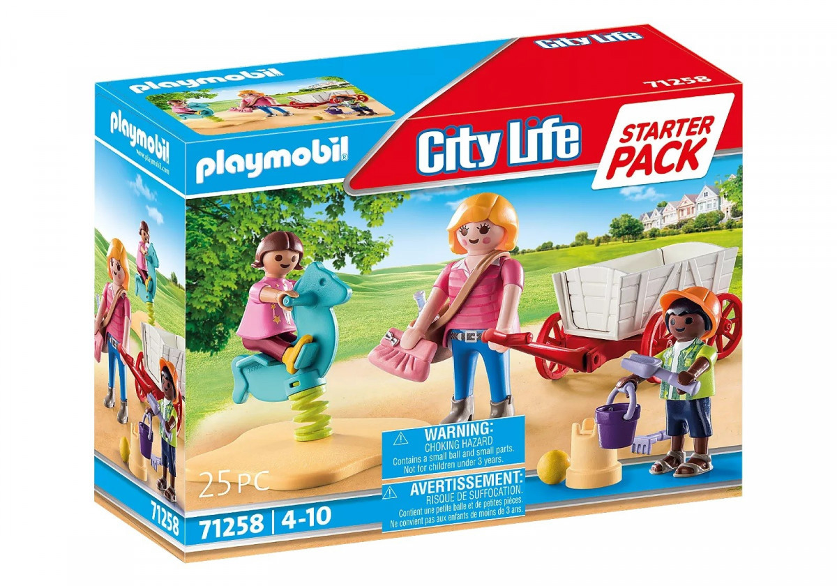 Pakiet startowy Opieka dzienna z wózkiem z konikiem bujanym i zabawkami do piasku.Wciel się w rolę wychowawcy z uroczym pakietem startowym Daycare od PLAYMOBIL. Razem z wychowawcą dzieci wybierają się na plac zabaw. Zabawki do piasku i butelka wody są bezpiecznie schowane w wózku ręcznym. Gdy tylko dotrą na miejsce, dzieci wskakują prosto do piaskownicy i na zabawny bujany koń. Szczegółowy zestaw do zabawy dla dzieci w wieku od 4 lat. Zestaw zawiera trzy figurki PLAYMOBIL, wózek ręczny, zabawki do piasku, torbę, czapkę i inne fajne dodatki do pomysłowej zabawy w odgrywanie ról. Butelkę z wodą można przechowywać w torbie na ramię. Pakiety startowe PLAYMOBIL przeniosą Cię prosto w sam środek kolorowego świata PLAYMOBIL. Zestawy zawierają figurki i akcesoria do popularnych światów PLAYMOBIL, są szybkie w montażu i od razu gotowe do zabawy.