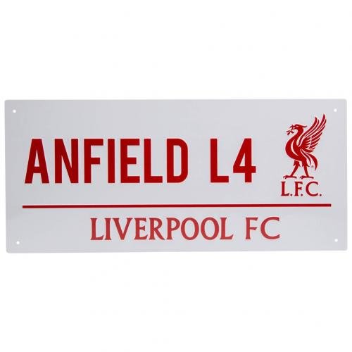 Oficiální cedule z katalogu produktů se znakem, grafikou v klubových barvách britského fotbalového klubu FC Liverpool.