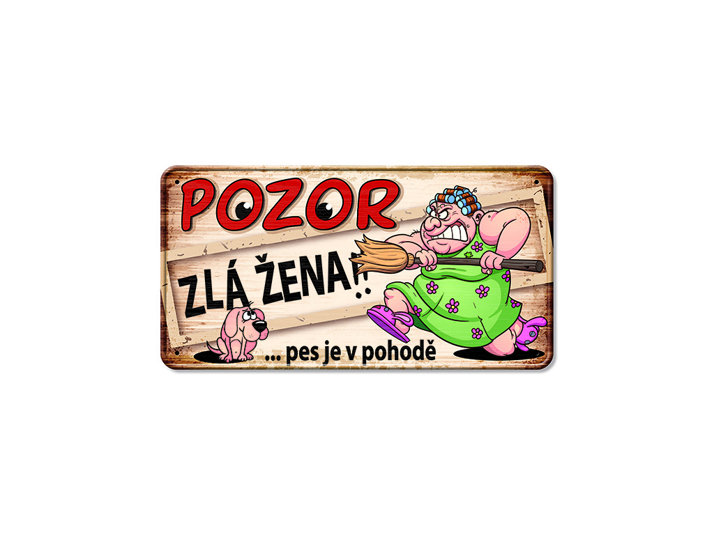 Vtipná plechová cedulka s textem "Pozor zlá žena! Pes je v pohodě." je jedinečný doplněk každého interiéru.