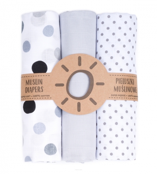 Mušelínové plenky 3ks + žínka zdarma - bílá/šedá - puntíky