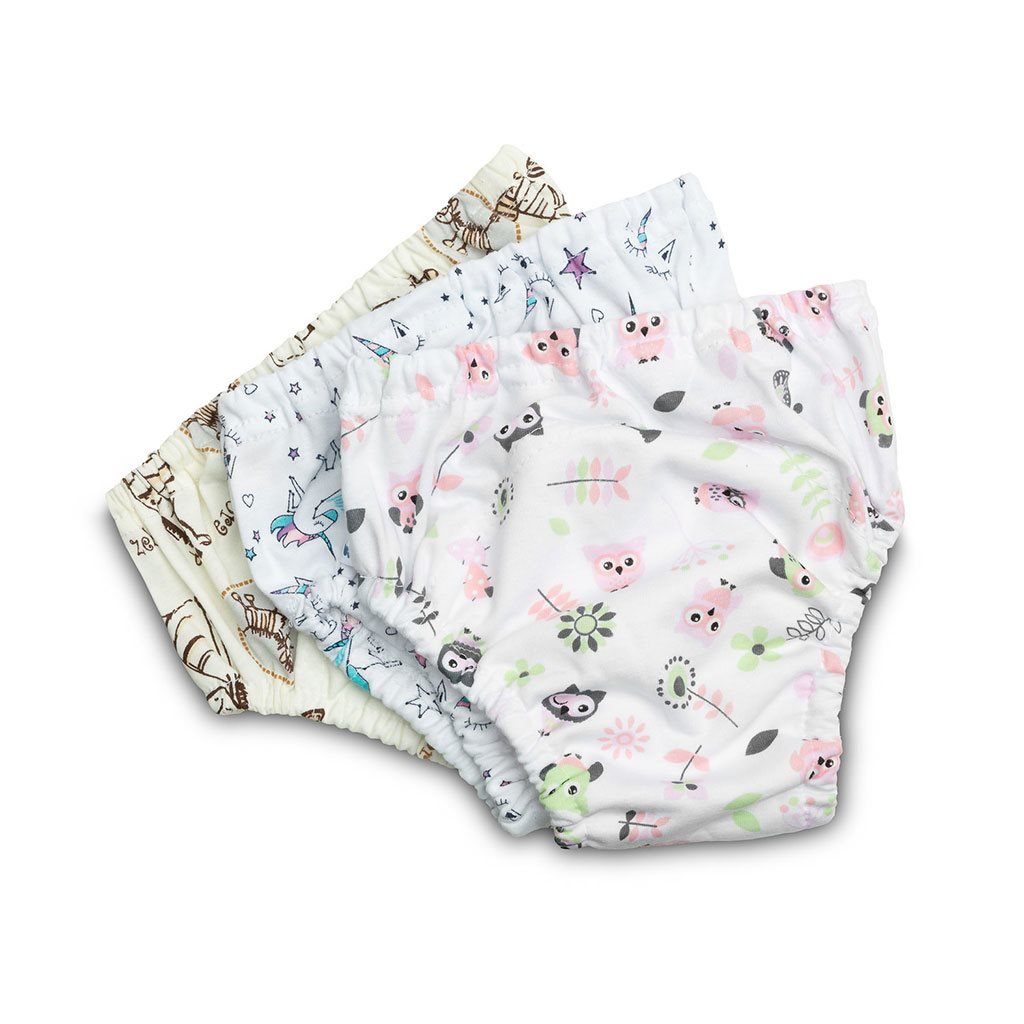 Tréninkové kalhotky jsou ideální pro první pár "skutečného" spodního prádla, pomáhají naučit se samostatně oblékat. Vyrobeno z měkké a prodyšné bavlny. Uvnitř mají vrstvu polyuretanové membrány, která snižuje propustnost vody. Vzory v sadách jsou náhodně vybírány podle dostupnosti materiálů. Vždy je však zachováno rozdělení na sady věnované chlapcům a dívkám.