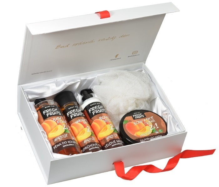 Pěna do koupele 500 ml - Aromatická koupelová pěna s vůní meruňky obohacená o zvláčňující oleje zabraňuje vysoušení pokožky. Jemně provoní pokožku a zanechá ji hebkou, jemnou a vláčnou. Během koupele dochází k celkové regeneraci organismu, zklidnění a harmonii tělesné a duševní pohody. Vhodné i pro děti od 3 let.Sprchový gel 250 ml - Přírodní receptura sprchového gelu a šampónu v jednom s Panthenolem a mandlovým olejem pro šetrné mytí těla a vlasů. Gel zanechá vaši pokožku hedvábně jemnou a čistou. Příjemná vůně meruňky dokonale osvěží vaše tělo i mysl. Jemné složení sprchového gelu je vhodné pro každodenní péči o pokožku i vlasy pro muže i ženy.Tělové mléko 250 ml - Bohatá hedvábná textura tělového mléka obohacená o jedinečné přírodní výtažky se rychle vstřebává do pokožky a zanechává ji dokonale hydratovanou, vláčnou a nádherně provoněnou. Tělové mléko zajistí až 48hodinovou hydrataci a dodá pokožce pružnost a pevnost. Svěží ovocná vůně dodává energii na celý den.Krém na obličej a tělo 200 ml - Zvláčňující krém s meruňkovým olejem a vitamínem E pro každodenní použití posiluje přirozenou ochrannou bariéru pokožky a chrání ji před nepříznivými vlivy vnějšího prostředí. Poskytuje suché a dehydrované pokožce maximální ochranu a komfort. Sametově krémová textura se snadno vstřebává, pomáhá pokožku zpevňovat a vyhlazovat a současně ji zajišťuje 48hodinovou hydrataci. Příjemná ovocná vůně. Vhodný pro všechny typy pleti. Masážní žínkaDekorativní box