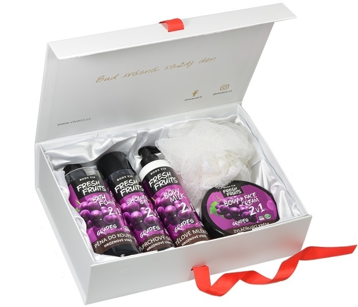 Pěna do koupele 500 ml - Aromatická koupelová pěna s vůní hroznového vína obohacená o zvláčňující přírodní oleje zabraňuje vysoušení pokožky. Jemně provoní pokožku a zanechá ji hebkou, jemnou a vláčnou. Během koupele dochází k celkové regeneraci organismu, zklidnění a harmonii tělesné a duševní pohody. Vhodné i pro děti od 3 let.Sprchový gel 250 ml - Přírodní receptura sprchového gelu a šampónu v jednom s Panthenolem a mandlovým olejem pro šetrné mytí těla a vlasů. Gel zanechá vaši pokožku hedvábně jemnou a čistou. Příjemná vůně hroznového vína dokonale osvěží vaše tělo i mysl. Jemné složení sprchového gelu je vhodné pro každodenní péči o pokožku i vlasy pro muže i ženy.Tělové mléko 250 ml - Bohatá hedvábná textura tělového mléka obohacená o jedinečné přírodní výtažky se rychle vstřebává do pokožky a zanechává ji dokonale hydratovanou, vláčnou a nádherně provoněnou. Tělové mléko zajistí až 48hodinovou hydrataci a dodá pokožce pružnost a pevnost. Svěží ovocná vůně dodává energii na celý den.Krém na obličej a tělo 200 ml - Zvláčňující krém s hroznovým olejem a vitamínem E pro každodenní použití posiluje přirozenou ochrannou bariéru pokožky, chrání ji před nepříznivými vlivy vnějšího prostředí a poskytuje suché a dehydrované pokožce maximální ochranu a komfort. Sametově krémová textura se snadno vstřebává, pomáhá pokožku zpevňovat a vyhlazovat a současně ji zajišťuje 48hodinovou hydrataci. Příjemná ovocná vůně. Vhodný pro všechny typy pleti. Masážní žínkaDekorativní box