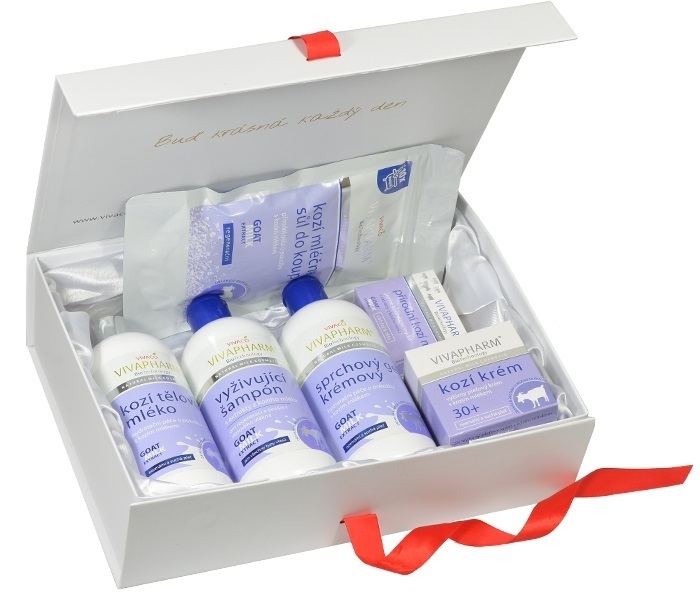 Luxusní balení kosmetiky s kozím mlékem pro péči o pokožku těla i obličeje ve velké dárkové krabici. To je dárek, který potěší každého milovníka přírodní kosmetiky. Kosmetika s kozím mlékem je návratem k přírodě a přírodním zdrojům. Obsahuje velké množství minerálních látek, stopových prvků, vitamínů a kyselinu listovou. Příznivě působí na pokožku, kterou vyživuje, zvláčňuje a zjemňuje, zajišťuje vyrovnané pH a dostatečnou hydrataci. Zanechává pokožku hebkou a jemnou. Velice kladně působí na citlivou a problematickou pokožku, je vhodné i pro alergiky, psoriatiky a atopiky.
