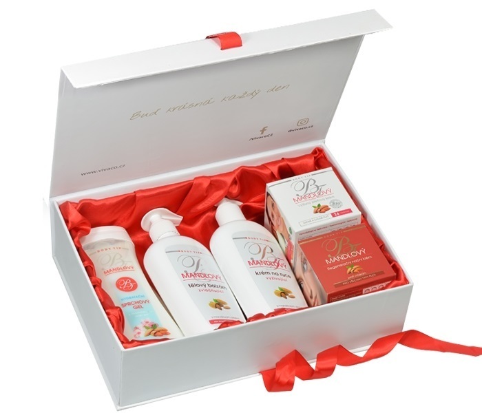 Luxusní balení kosmetiky s mandlovým olejem pro péči o pokožku těla i obličeje ve velké dárkové krabici. Kosmetika s vysokým obsahem přírodního mandlového oleje dodá suché kůži potřebnou výživu, ochranu a hydrataci. Zpevňuje zralou pleť, hloubkově regeneruje a navrací pokožce přirozenou pružnost a hebkost. Mandlový olej nevyvolává alergické reakce a je vhodný pro všechny typy pleti, včetně citlivé. Výživná mandlová kosmetika má dlouhou tradici, díky její příjemné vůni a účinkům ji milují české ženy napříč všemi generacemi.