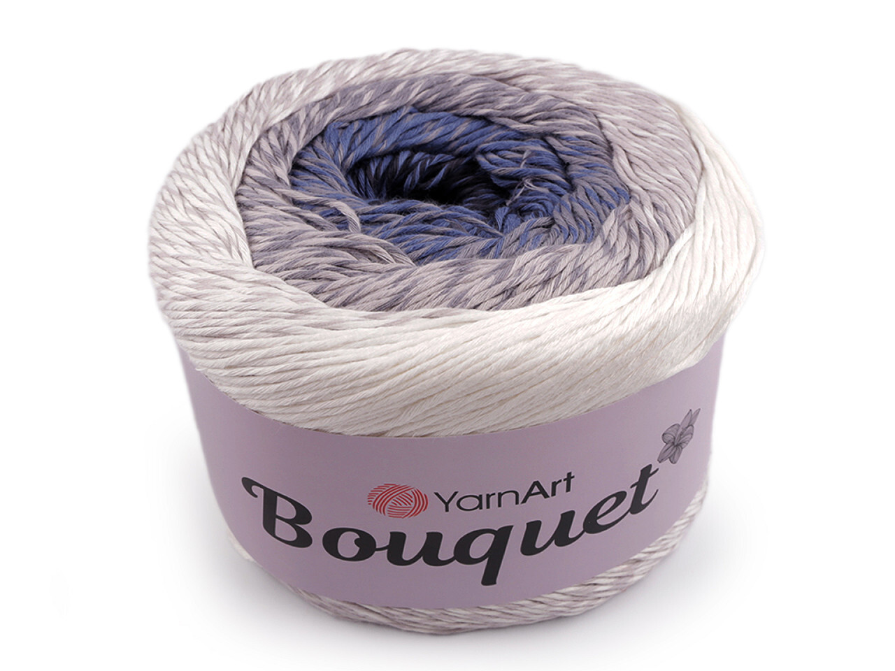 Bavlněná pletací příze Bouquet je zajímavá svými pozvolnými barevnými přechody, se kterými budou všechny výrobky vypadat originálně. Je velmi příjemná na těle a vhodná na pletení i háčkování plédů, letních svetříků, ponč, šálů apod. Velikost jehlic: 4Velikost háčku: 4