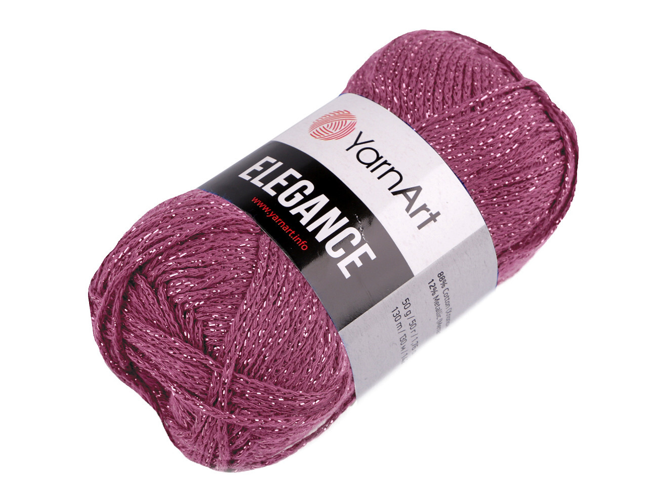 Pletací příze Elegance připomíná provázek. Je protkaná třpytivým lurexem. Můžete z ní uplést či uháčkovat svetříky, šály, čepice apod.Velikost jehlic: 4Velikost háčku: 4