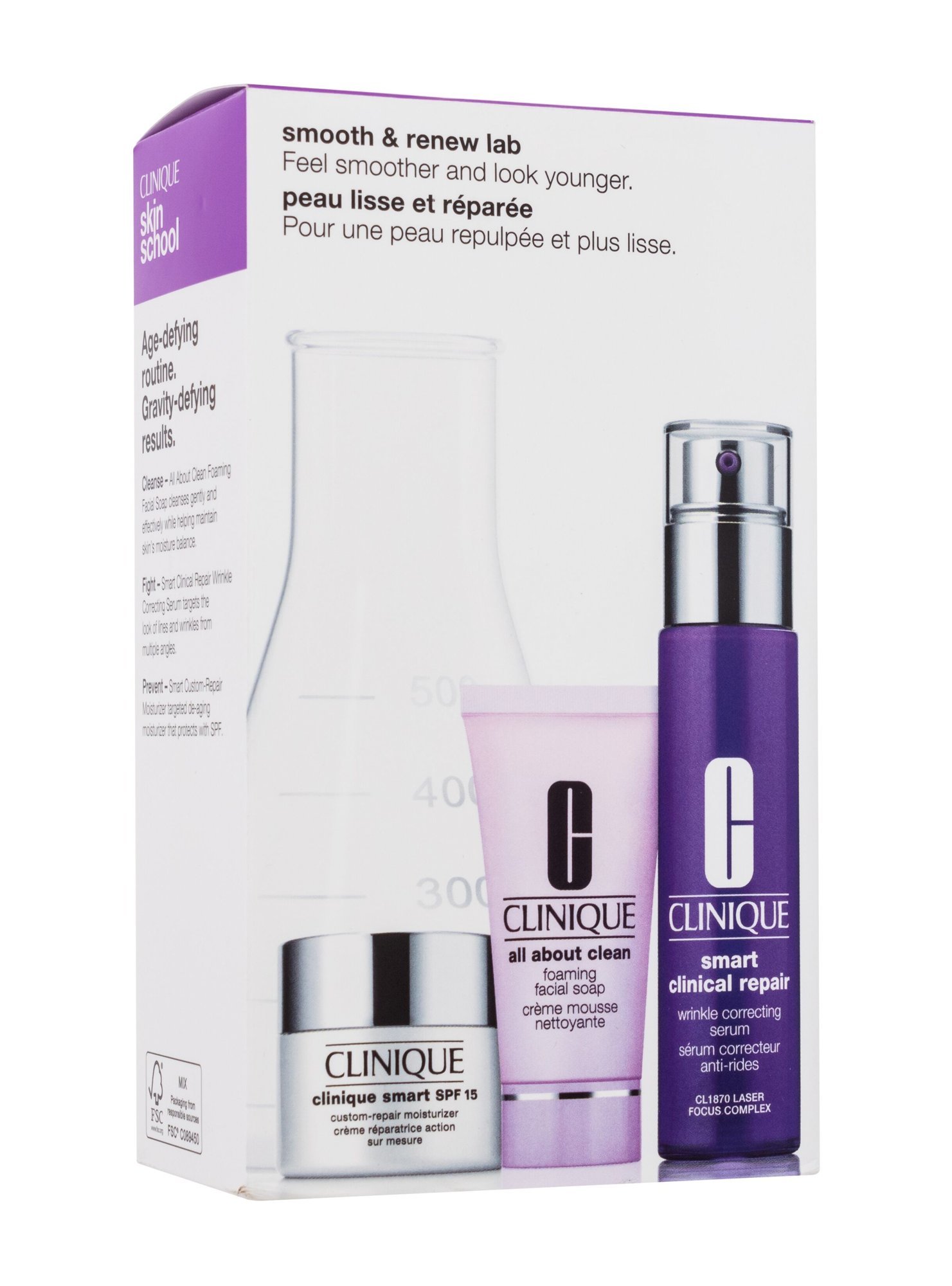 Clinique Smooth & Renew Lab pleťové sérum Smart Clinical Repair Wrinkle Correcting Serum 30 ml + pleťový krém Smart Custom-Repair Moisturizer SPF15 15 ml + pleťové mýdlo All About Clean Foaming Facial Soap 30 ml