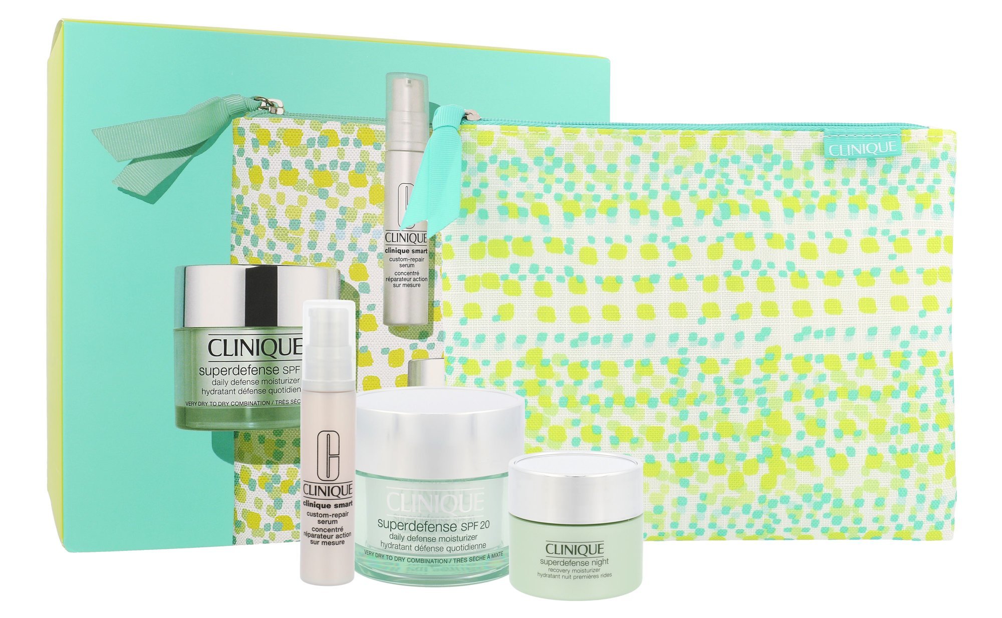 Sada pleťové péče **Clinique Superdefense**. **Složení kazety:** **Hydratační denní krém Clinique Smart SPF20 50 ml** Chrání pleť proti známkám únavy a stárnutí pleti. Hydratuje pokožku během celého dne. Chrání před UVA/UVB slunečním zářením. Obsahuje ochranný faktor SPF20. Zanechává pleť hloubkově hydratovanou, jemnou a svěží. **Použití:** Aplikujte na čistou pleť. **Hydratační noční krém Clinique Smart Night 15 ml** Pleť hloubkově hydratuje. Po náročném dni Vaši pleť regeneruje a zklidňuje. **Použití:** Aplikujte každý večer na vyčištěnou pleť. **Pleťové sérum Clinique Smart Custom 10 ml** Redukuje jemné vrásky a zpevňuje pokožku. Zjemňuje pleť a sjednocuje její barevný tón. Zanechává pleť sjednocenou, vyhlazenou a zářivou. **Použití:** Aplikujte ráno a večer na čistou pleť.