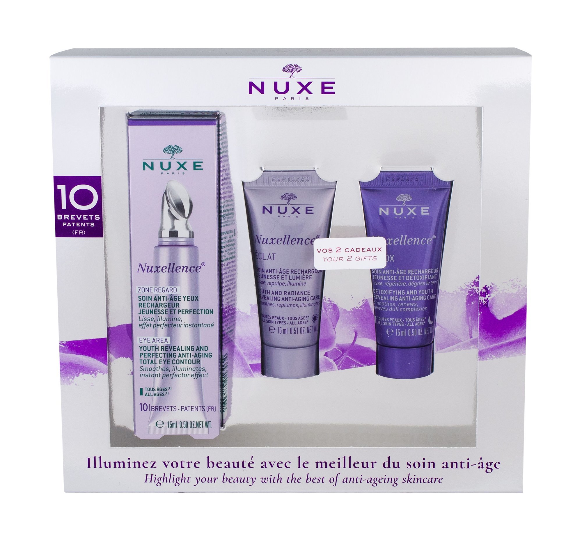 **Dárková sada Nuxe Nuxellence.** Složení kazety: Protivársková oční péče **NUXE Nuxellence 15 ml**. NUXE Nuxellence pomáhá pleť omlazovat a rozjasňovat. Šetrně pečuje o citlivou oblast kolem očního okolí. Másážní aplikátor redukuje vrásky a jemné linky. Snižuje výskyt zarudnutí, otoky a kruhy pod očima. Den za dnem bude Vaše pleť jemnější, hebká a projasněná. Oční okolí bude vypadat zářivější a mladší. **Použití**: Aplikujte na oblast kolem očního okolí. Rozjasňující péče **Nuxe Nuxellence Eclat Youth And Radiance Anti-Age Care 15 ml**. Rozjasňující péče Nuxe Nuxellence Eclat Youth And Radiance Anti-Age Care dodává pokožce svěží a sjednocený tón. Bojuje proti známkám stárnutí pokožky, jako jsou vrásky a jemné linky. Lehká textura se ihned vstřebává a rozjasňuje pleť. Po použití bude Vaše pokožka zpevněná a hebká na dotek. Jemná květinová vůně povzbudí Vaše smysly. Vhodné pro všechny typy pleti. **Použití**: Aplikujte na čistou pleť. Detoxikační noční péče **Nuxe Nuxellence Detox Anti-Aging Night Care**. Nuxe Nuxellence Detox Anti-Aging Night Care je vyživující přípravek, který pleť dokonale hydratuje, regeneruje a obnovuje. Složení obsahuje hedvábí a extrakt z květu mučenky, které pleť povzbuzují a regenerují. Dodává pleti novou energii a intenzivní péči. Po probuzení bude pleť svěží, omlazená a prozářená. Vhodné pro všechny typy pleti. **Použití**: Aplikujte večer na čistou pleť.