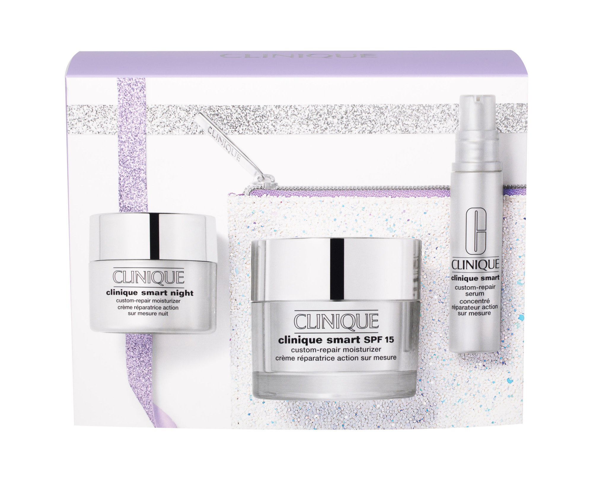 Sada pleťové péče **Clinique Clinique Smart**. **Složení kazety:** **Hydratační denní krém Clinique Smart SPF15 50 ml** Chrání pleť proti známkám únavy a stárnutí pleti. Hydratuje pokožku během celého dne. Díky ochraně SPF15 chrání pokožku před slunečním zářením. Zanechává pleť hloubkově hydratovanou, jemnou a svěží. **Použití:** Aplikujte na čistou pleť. **Hydratační noční krém Clinique Smart Night 15 ml** Pleť hloubkově hydratuje. Podporuje přirozenou tvorbu kolagenu a tak zabraňuje prvním příznakům stárnutí. Po náročném dni Vaši pleť regeneruje a zklidňuje. **Použití:** Aplikujte každý večer na vyčištěnou pleť. **Pleťové sérum Clinique Smart Custom 10 ml** Redukuje jemné vrásky a zpevňuje pokožku. Zjemňuje pleť a sjednocuje její barevný tón. Zanechává pleť sjednocenou, vyhlazenou a zářivou. **Použití:** Aplikujte ráno a večer na čistou pleť.