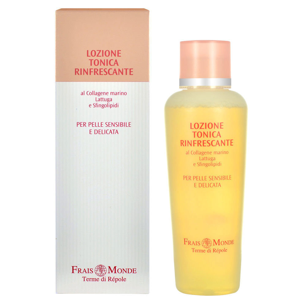 Osvěžující pleťový tonik **Frais Monde Toning Refreshing Lotion**. Osvěžující pleťový tonik Frais Monde Toning Refreshing Lotion na přírodní bázi odstraňuje nečistoty z pleti a make-up. Pro dokonalý revitalizační efekt je ideální tonik použít po čistícím pleťovém mléku. Ideální pleťová péče pro citlivou pleť. **Použití**: Aplikujte na pleť pomocí vatového tamponu.