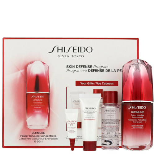 Dárková sada **Shiseido Ultime** obsahuje kompletní péči pro vaši pleť. Produkty pro omlazení až po čištění zajistí, že vaše pleť bude dokonale krásná a svěží. ### Co naleznete uvnitř dárkové kazety? **Shiseido Ultime Power Infusing 50 ml** Pleťové sérum zvyšuje kvalitu pokožky a lépe ji připravuje na další péči. Chrání a posiluje pokožku pro zabránění předčasnému stárnutí a zvýšení odolnosti pleti. **Použití:** Použijte dvě dávky ráno a večer na očištěnou pleť. Aplikujte před použitím hydratačního krému. **Shiseido Clarifying Cleansing Foam 15 ml** Čistící pěna zbavuje pokožku nečistot a odumřelých kožních buněk. Vytváří krémovou pěnu s hydratačním a změkčujícím účinkem. Pomáhá detoxikovat pleť. **Použití:** Používejte ráno a večer na navlhčenou pleť. Masírujte krouživými pohyby pro napěnění a poté důkladně opláchněte. **Shiseido Treatment Softener Lotion Soin 30 ml** Pleťová voda pomáhá hloubkově hydratovat pokožku na 24 hodin a zjemnit ji. Podporuje pokožku v boji proti pigmentovým skvrnám a vráskám. Posiluje imunitní buňky proti oxidaci a pro obnovení přirozené ochrany. **Použití:** Použijte ráno a večer na vyčištěnou pleť pomocí vatového tampónku. **Shiseido Ultime Power Infusing Eye Concentrate 3 ml** Oční krém bojuje proti výskytu vrásek, tmavých kruhů a otoků v okolí očí. Vytváří na pokožce jemný závoj, který chrání před nečistotami a oxidací. Po celou dobu vyživuje a posiluje. **Použití:** Aplikujte jednou nebo dvakrát denně po vyčištění pleti.