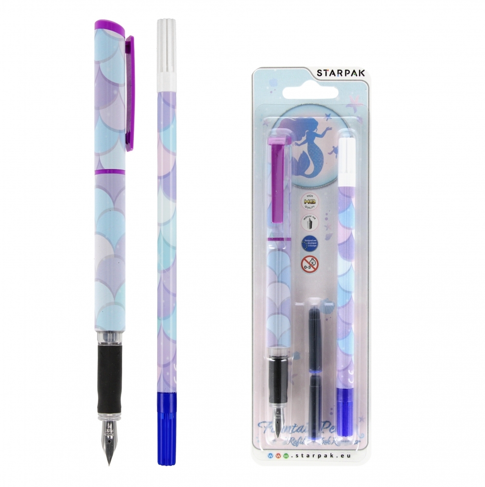 Zalety produktu: Pióro wieczne Syrenka STARPAK o kształcie dostosowanym do dłoni dziecka, z wytrzymałą stalówką, wykonaną z wysokiej jakości materiału. Specjalnie wyprofilowana, antypoślizgowa strefa uchwytu zapewnia komfort i pomaga w nauce pisania Twojego dziecka. Zapoznaj się również z innymi produktami dedykowanymi biurze i szkole W piórze znajduje się miejsce na zapasowy wkład, dzięki czemu Twojemu dziecku nigdy nie zabraknie atramentu w trakcie pisania. Całość została ozdobiona elegancką grafiką Syrenka. W zestawie dwa naboje wymienne i dwustronny wymazywacz w pisaku. Końcówka wymazująca oznaczona białą zakrętką skutecznie usuwa błędy, a końcówka korygująca oznaczona niebieską zakrętką pozwala na poprawę błędów. Wymazywacz również został ozdobiony nadrukiem Syrenka, dzięki czemu tworzy komplet z piórem wiecznym. Wykonane z trwałego materiału. Zestaw pakowany na blistrze. Produkt nieodpowiedni dla dzieci poniżej 3 lat. Wymiary produktu pióro 13 cm, wymazywacz 17 cm. Wymiary opakowania wys. x szer. x gł. cm : 23x7x2 Waga opakowania kg. 0,03kg. Pakowanie karton 40szt.