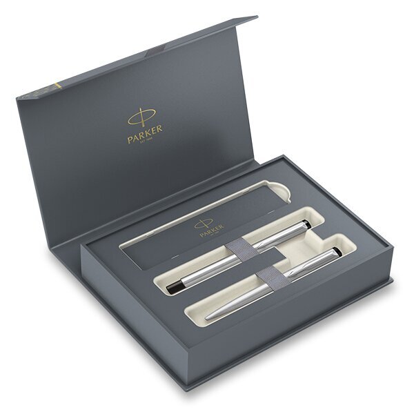 Sada plnicí pero a kuličkové pero Parker Vector Stainless Steel CT v dárkové kazetě. Tělo, víčko i doplňky z ušlechtilé nerezové oceli. Hrot z ušlechtilé nerezové oceli.