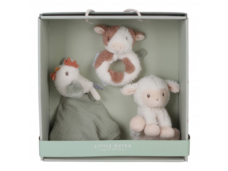 Tato dárková sada obsahuje tři roztomilé a jemné plyšové hračky: chrastítko v podobě kravičky, muchláček se slepičkou a plyšovou ovečku. Každá z hraček je navržena tak, aby podněcovala smyslový rozvoj dítěte a zároveň nabízela bezpečnou a příjemnou zábavu od narození. Hračky jsou součástí designové kolekce Little Dutch Farma, která vyniká nejen kvalitou, ale i veselým a přívětivým motivem zvířátek z farmy.