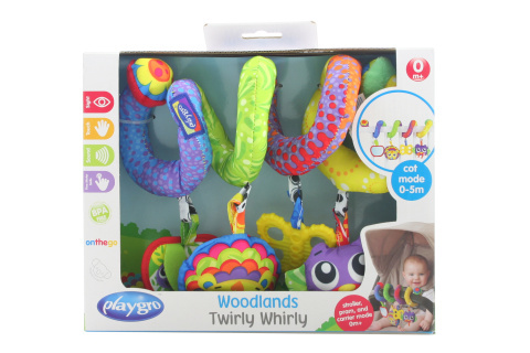 Měkká textilní spirála se snadno omotá kolem rukojeti kočárku nebo autosedačky. Během jízdy se na spirále budou pohupovat měkká textilní zvířátka, která překvapují i svými zvuky - hračky šustí a nebo chrastí. Na spirále visí i zrcátko, se kterým děti mohou krát hru na jukanou. Při růstu zoubků oceníte i kousátko ve tvaru motýlka. Rozměry balení cca 26 x 21 x 6 cm. Věk 0m+.