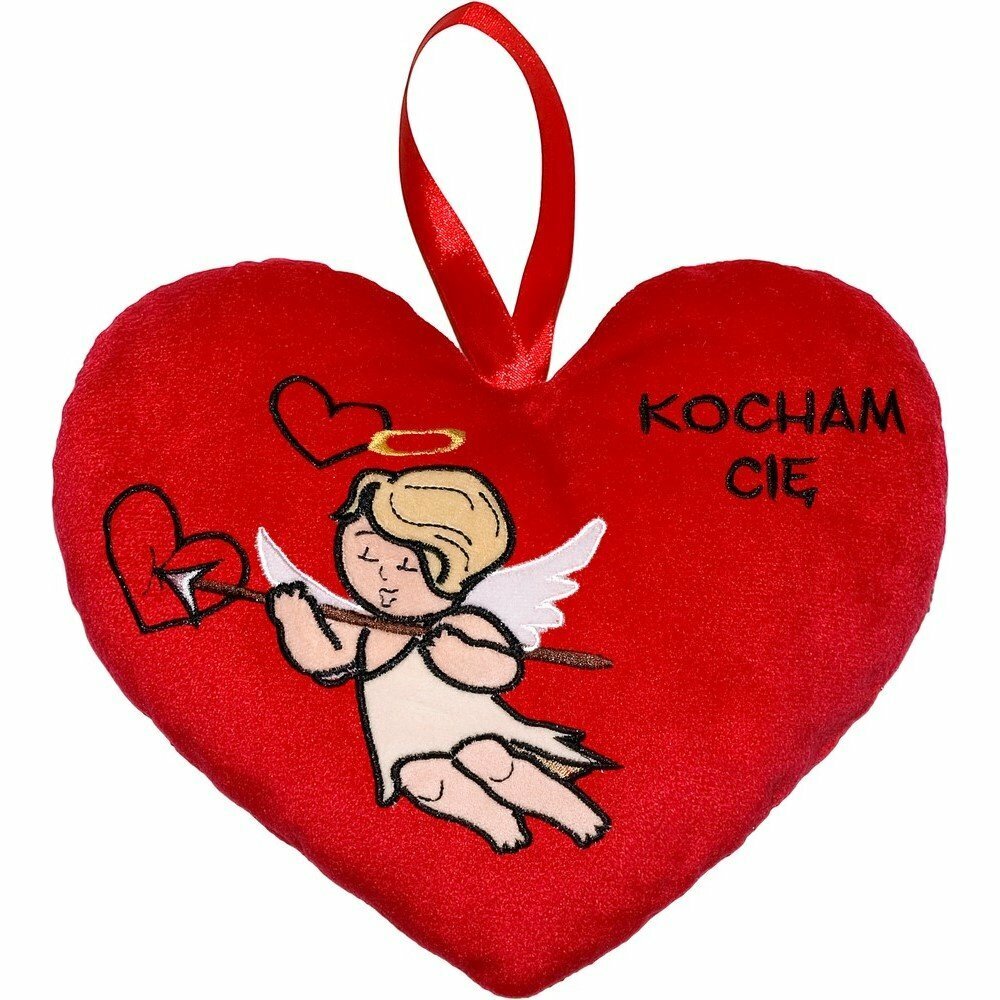 Miękka pluszowa poduszka, w kształcie serca. Na froncie poduszki piękny haft amorka i napis: Kocham Cię Możliwość zawieszenia na ścianie, wieszaczku. Wyjątkowy prezent dla wyjątkowej osoby. Wyznaj swoje uczucie, podaruj serce!Wymiary poduszki: 20cm szer.