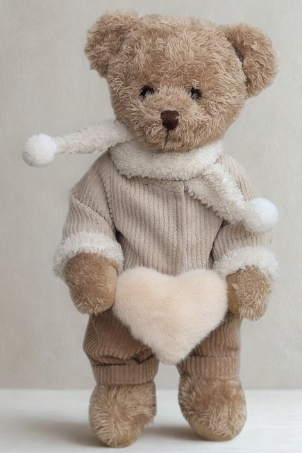 Plyšový medvěd v béžovém overalu se srdíčkem