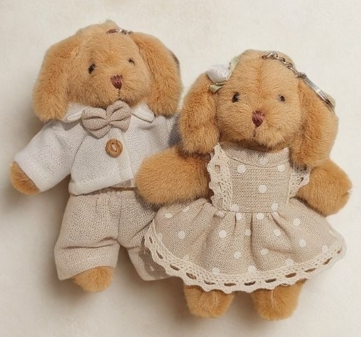 Pár přívěsků na klíče s motivem psů v béžovém outfitu