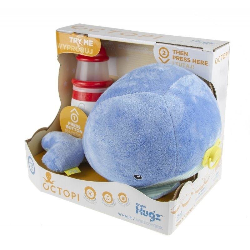 Ocean Hugz - Maskotka Wielorybek i Projektor Latarnia Morska DKM6869. Gdy przytulisz pluszaka, latarnia morska zaczyna grać kołysanki i świecić. Możliwe jest również włączenie samej latarni morskiej, bez konieczności przytulania pluszaka. Latarnia Morska gra kołysanki, świeci delikatnym światłem i wyświetla gwiazdki na suficie. Posiada okrągłą podstawę, dzięki której może się delikatnie kołysać. Ośmiorniczka w kolorze fioletowym posiada żółty, plastikowy smoczek. Latarnia rozświetli pokój i ukołysze Twoje dziecko do snu.