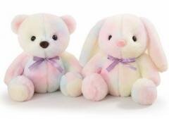 Przedstawiamy urocze pluszowe maskotki w pastelowych, tęczowych odcieniach, które rozświetlą każdy dzień. Do wyboru jest klasyczny miś lub słodki zajączek z długimi uszami. Każda przytulanka wykonana została z wyjątkowo miękkiego i puszystego pluszu, który jest niezwykle przyjemny w dotyku i zachęca do tulenia. Kolorystyka to delikatne połączenie różu, błękitu i żółci, tworzące subtelny efekt tęczy. Dodatkowego uroku dodaje satynowa fioletowa kokardka zawiązana pod szyją. Maskotki są bezpieczne dla dzieci i będą doskonałym towarzyszem zabaw, snu oraz piękną ozdobą dziecięcego pokoju. Idealne na prezent z okazji narodzin, urodzin lub Dnia Dziecka. Cena dotyczy zakupu jednej maskotki.