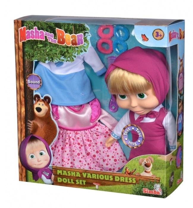Ta wspaniała lalka zachwyci nie tylko fanki przygód Maszy i jej przyjaciela niedźwiedzia Miszy. Jej zawsze uśmiechnięta, zawadiacka mina zjednuje jej sympatię dzieci na całym świecie. Podczas zabawy lalka wygrywa zabawną melodię - funkcja ta uruchamiana jest poprzez naciśnięcie wyznaczonego miejsca na brzuszku. Masza posiada gumową głowę, dłonie i stopy oraz miękki, materiałowe korpus. Uwagę przyciągają jej ogromne, zielone oczy oraz dziewczęce piegi na policzkach. Lalka do złudzenia przypomina swój serialowy odpowiednik. Ubrana jest w ciemnoróżową sukienkę z białymi rękawkami i kolorystycznie dopasowaną wiązaną chustkę. Wszystkie elementy ubranka można zdjąć. W zestawie z lalką dziecko znajdzie dodatkowe 2 sukienki na różne okazje, grzebień oraz kolorowe gumki frotki do spinania kucyków Maszy.
